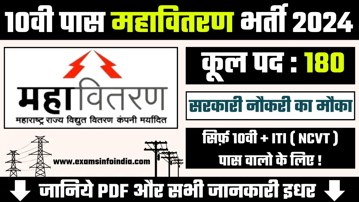 Mahavitran Dharashiv Bharti 2024: महाराष्ट्र राज्य विद्युत वितरण कंपनी (महावितरण) ने धाराशिव मंडल कार्यालय में ‘अप्रेंटिस’ पदों पर भर्ती के लिए आवेदन आमंत्रित की हैं। इस भर्ती में 180 रिक्त पद उपलब्ध हैं, जिसमें इलेक्ट्रिशियन, वायरमैन, और कंप्यूटर ऑपरेटर (COPA) ट्रेड्स शामिल हैं। यह प्रक्रिया अप्रेंटिस एक्ट 1961 और अप्रेंटिसशिप नियम 1992 के तहत पूरी … Read more